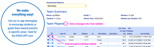 Stay in touch! First In Math makes it easy to keep the lines of communication open. Message any student, or the whole class, at any time. From your Homepage, click Assessment Reports* and choose a report. Next, click the small Envelope icon in the left-hand column next to the student's User ID — compose your message, then send.